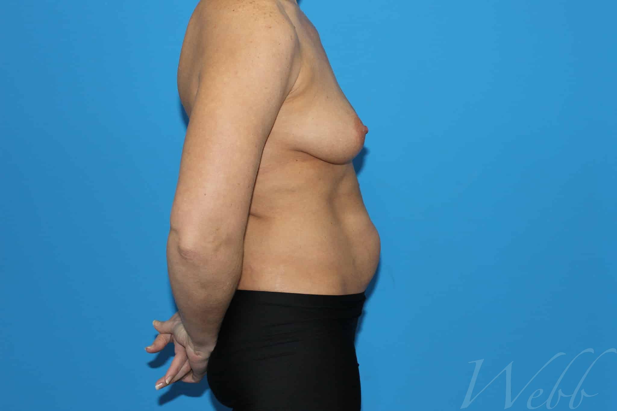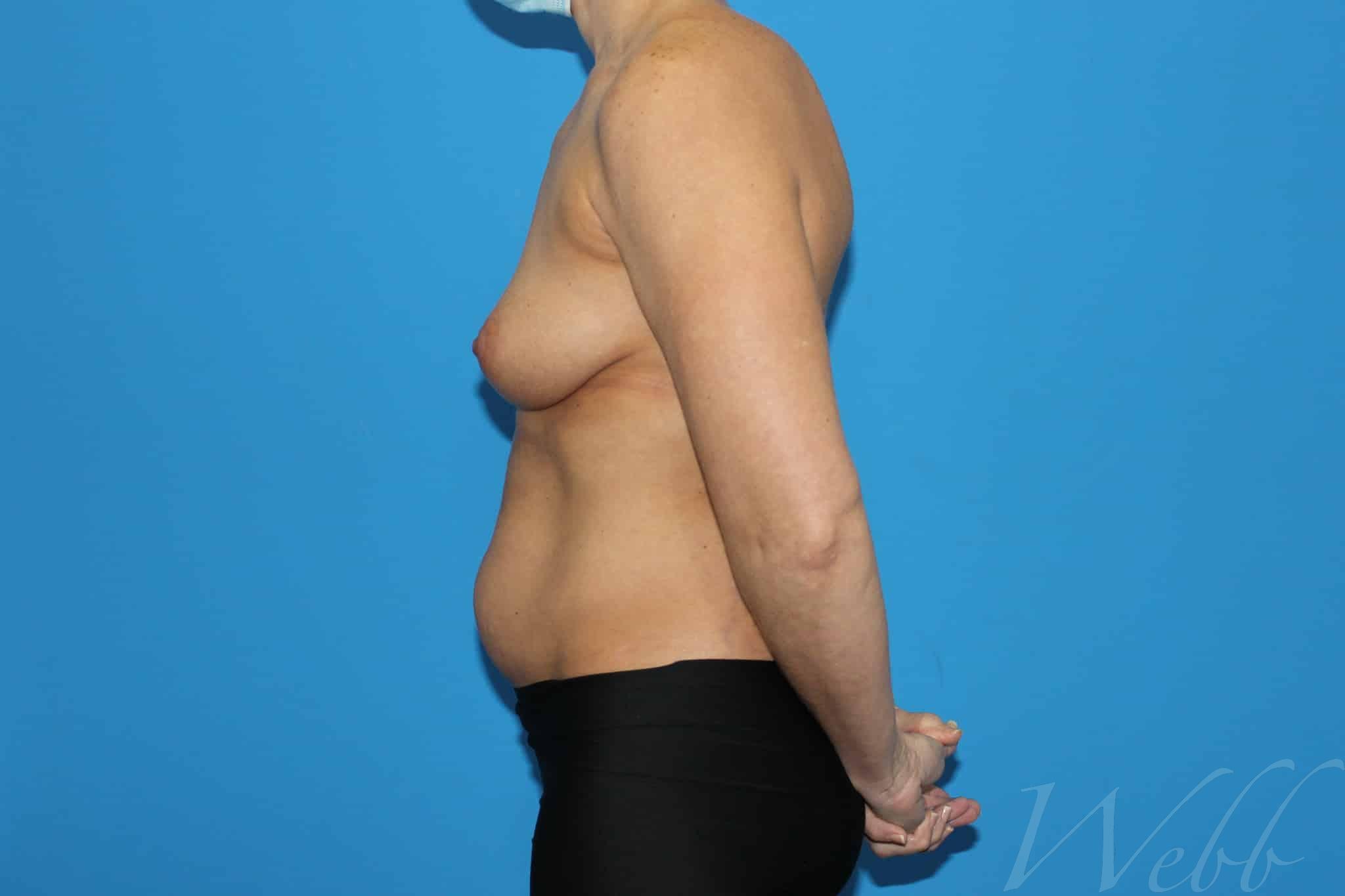 This mother wished to address asymmetry and drooping of her breasts as well as adiposity of her waist. She is shown following placement of Allergan high profile gel implants (325cc on the right and 345cc on the left) and liposuction of 1.4 liters of fat from her waist.